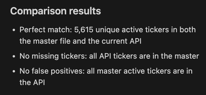 To make sure your master list is correct, you can compare the active tickers in your master list with the active list response from Polygon.