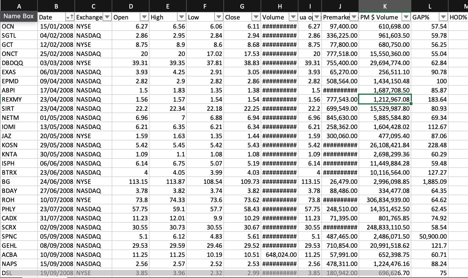 So, I requested from Spikeet all gaps greater than 50% with pre-market volume over $200K since 2008. I downloaded 3,636 instances that met the criteria into an Excel sheet, ready to run a no-code backtest.